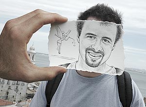 O artista belga Ben Heine usa desenhos feitos a lápis sobre papel branco para brincar e interferir na realidade estampada em fotos.