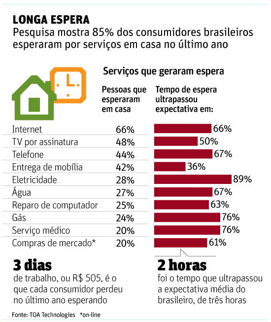 Entre os consumidores que tiveram que aguardar (85% do total, segundo os dados da TOA), 66% ficaram em casa à espera de serviços de internet. Já 48% levaram "chá de cadeira" dos atendentes de TV por assinatura; 44%, dos de telefonia; e 42%, dos entregadores de mobília.
