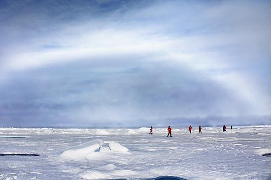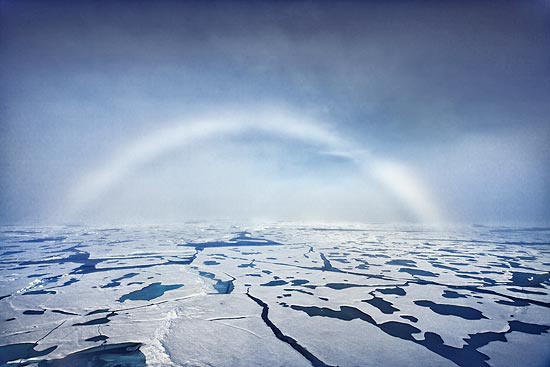 barco quebra-gelos em que viajava, com um arco-íris totalmente branco no